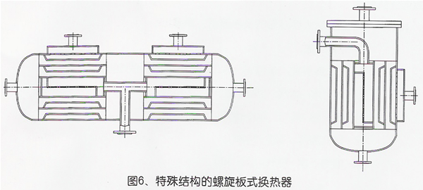 有些化工上用的螺旋板式換熱器,根據(jù)加工工藝的要求,需要諸如的特殊結(jié)構(gòu),兩端帶有封頭、端蓋或兩個換熱器串到一起,結(jié)構(gòu)不一,需要設(shè)計部門專門設(shè)計。
