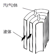對于換熱的兩種介質(zhì),一種是液體,另一種是汽(氣)體,可按錯流方式流動,所謂錯流,是指液體按螺旋方向流動,汽(氣)體按換熱器的軸向直接通過,如圖三,這主要是考慮到汽(氣)體的特點,適于較大的流量,減少阻力,適用于有機蒸汽冷凝。根據(jù)具體工況,蒸汽也可按螺旋方向流動,但氣體由于熱容量較小,一般那要按軸向直接通過。