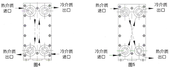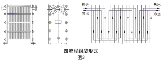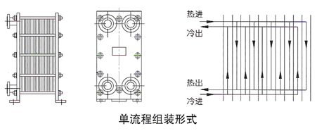 板式換熱器根據(jù)介質(zhì)的溫差和流量,可以裝配成單流程、雙流程、三流程以及多流程的形式。單流程是指介質(zhì)在換熱器內(nèi)流過(guò)一個(gè)流程,雙流程是指介質(zhì)在換熱器內(nèi)折返流過(guò)兩個(gè)過(guò)程,依次類(lèi)推,各種流程的外形圖和其流程示意圖如圖3。當(dāng)采用多流程時(shí),換熱器的四個(gè)接口就不能在同一側(cè)的夾緊板上,進(jìn)出口要位于前后兩個(gè)夾緊板上。