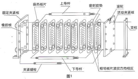 板式換熱器的結(jié)構(gòu)分解如圖1,產(chǎn)品外型如圖2,主要部件是由換熱板片、密封膠墊、夾緊板、導(dǎo)桿、夾緊螺栓組成。換熱板片是由不銹鋼板壓制成型,它上面開(kāi)有4個(gè)流道孔,中部壓成人字形波紋,四周壓有密封槽。密封槽內(nèi)粘有密封膠墊。換熱板片通過(guò)兩導(dǎo)桿定位對(duì)齊,兩夾緊板通過(guò)夾緊螺栓將各板片壓緊,從而形成換熱器內(nèi)腔換熱流道。相鄰換熱板片的人字形波紋方向安裝時(shí)相反,接觸點(diǎn)彼此相互支撐。人字形波紋和這些支撐點(diǎn)使流體介質(zhì)在其內(nèi)部流動(dòng)時(shí)充分形成湍流,這是板式換熱器具有很高換熱效率的主要原因。另外換熱板片厚度較薄,導(dǎo)熱熱阻較小,板片兩側(cè)的流體介質(zhì)流動(dòng)分布較為均衡,也使得傳熱較為充分。
