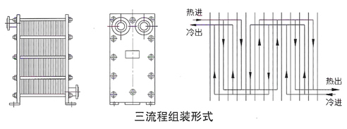 當(dāng)兩種介質(zhì)的流量不同且大致為2:1且不易裝配成雙流程時(shí),可選擇該類(lèi)型的換熱器。它適用于小區(qū)集中供熱,一般一次網(wǎng)的熱水流量較小,二次網(wǎng)用戶(hù)取暖供水的流量較大的場(chǎng)合。